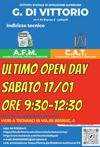 L’Istituto Tecnico “Di Vittorio” di Ladispoli invita studentesse, studenti delle classi terze della scuola secondaria di primo grado e le loro famiglie a partecipare all’ultimo Open Day, che si terrà sabato 17 gennaio 2026, dalle 9:30 alle 12:30.