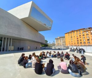 Il percorso è poi proseguito al MAXXI – Museo nazionale delle arti del XXI secolo, progettato da Zaha Hadid, dove l’uscita didattica si è trasformata in un’esperienza di lettura consapevole dello spazio architettonico, grazie alla partecipazione degli studenti all’attività educativa “Leggere l’architettura”. L’attenzione è stata focalizzata sugli aspetti tecnologici e costruttivi del MAXXI: il calcestruzzo armato a vista, le superfici vetrate e le soluzioni strutturali innovative. Ne è emersa una lettura integrata dell’architettura, intesa come sintesi di forma, funzione e tecnica.